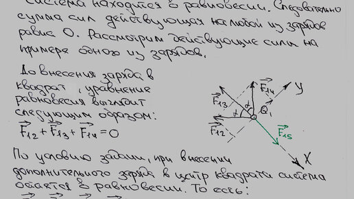 Задача: В каждой вершине квадрата находятся положительные заряды Q=10(-7)Кл (минус седьмой степени) каждый.Какой отрицательный заряд следует поместить в центре квадрата, что бы система находилась в равновесии? Решение: Задача по большому счёту геометрическая. Рассматриваем задачу на одном из шариков. Во первых чертим чертёж, далее отмечаем все силы действующие на шарик. Согласно условия задачи, шарик находится в равновесии, значит сумма векторов всех сил равна нулю. Проводим оси ОХ и ОУ, делаем на них проекции всех сил, и составляем формулы для каждой оси, теперь уже в скалярной форме...