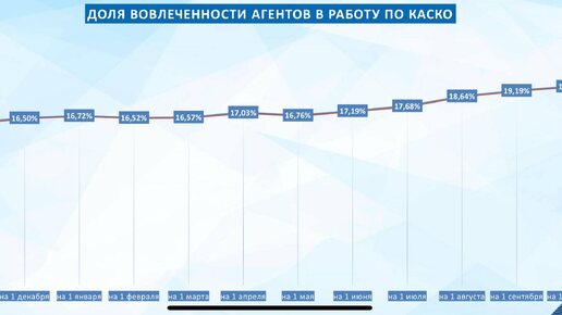 КАСКО. Рекорд за рекордом. За октябрь новые рекорды. Практически каждый месяц обновляем. Уже 20% агентов продают КАСКО, а рост продаж практически х2 к прошлому году и последняя неделя очередной рекорд продаж. Это говорит о том, что продукт уже отличный и становится все популярнее в агентской среде. В четвёртом квартале запускаем мегапрорывной IT-план, чтобы удержать темп х2 и задать новый уровень рынка...