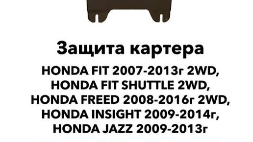 Защита картера Honda Fit 2WD / Fit Shuttle / Freed 2wd Защита картера специально разработана для: - Honda Fit 2007-2013г.в. 2WD (Кузов GE6, GE8, GP1, GP4) - Honda Fit Shuttle 2WD (Кузов GP2, GG7) - Honda Freed 2008-2016г.в. 2WD (Кузов GB3, GP3) - Honda Freed Spike 2WD (Кузов GB3, GP3) - Honda Insight 2009-2014г.в. (Кузов ZE2, ZE3, ZE5) - Honda Jazz 2009-2013г.в. (Кузов GG6, GE1, GE6, GP1) Внимание: на 4WD НЕ ПОДХОДИТ! Сталь 2мм Крепеж и инструкция...