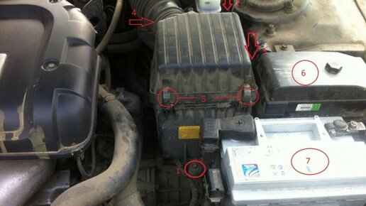 На замену датчика заднего хода на KIA Magentis вам понадобится 30 минут времени. Ничего сложного в этой процедуре нет. Покупаем новый датчик и приступаем.Для начала нужно снять воздушный фильтр, для этого откручиваем болты. Снимаем верхнюю часть крышки воздушного фильтра, отщелкивая защелки под номером 5 на рисунках. И ключем на 10 или крест отверткой ослабляем хомут (номер 4), вытаскиваем патрубок, снимаем крышку. (все отмечены на фото) Чтобы открутить 3 болт крепления корпуса воздушного фильтра придется открутить блок предохранителей, сдвинуть его (3 болта...