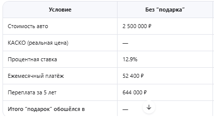 Банк говорит: «Мы дарим вам второй комплект резины или КАСКО — бесплатно!» Звучит щедро.