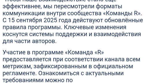 В начале года я попросился в команду р со своими мотивами. 😁 конечно все было в том что хотел попасть категорию. Но сколько бы я не писал меня не добавили туда, в категорию. По началу было интересно узнавать новости раньше чем многие . Но все это закончилось. С 15 сентября решили изменить команду р и просто вырезать половина народу. По просмотрам, глубине и много чему мой канал проходил. Ток обложек небыло на видео в основном, но это тайна покрытая мраком из-за чего меня турнули от туда. Жалание вернуться у меня больше нет...