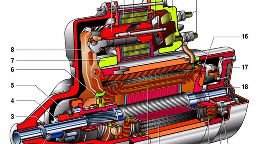 1 - крышка со стороны привода;  2 – стопорное кольцо;  3 – ограничительное кольцо;  4 – шестерня привода;  5 – обгонная муфта;  6 – поводковое кольцо;  7 – резиновая заглушка;  8 – рычаг привода;  9 – якорь реле;  10 – удерживающая обмотка тягового реле;  11 – втягивающая обмотка тягового реле;  12 – стяжной болт реле;  13 – контактная пластина; 14 – крышка реле;  15 – контактные болты;  16 – коллектор;  17 – щетка;  18 – втулка вала якоря;  19 – крышка со стороны коллектора;  20 – кожух;  21...