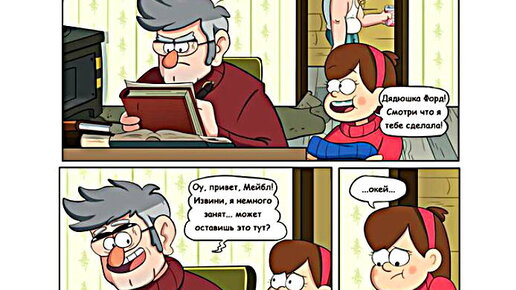 Холодные зимние будни. Как можно согреться в холода? С помощью, какао или горячего чая, тёплой одежды и хорошего настроения. Для создания позитивного настроя у нас есть юморные и трогательные истории. Например, комиксы о героях Гравити Фолз. В центре сюжетов окажутся близнецы Пайнсы, дети и взрослые. Основные диалоги будут между Мэйбл и Фордом, что уже немного неожиданно, ведь обычно это Диппер проводит с ним время. Сами посмотрите: Давайте почитаем 3 новые истории от разных художников из сборника комиксов, переведённых на русский язык сайтом readmanga...