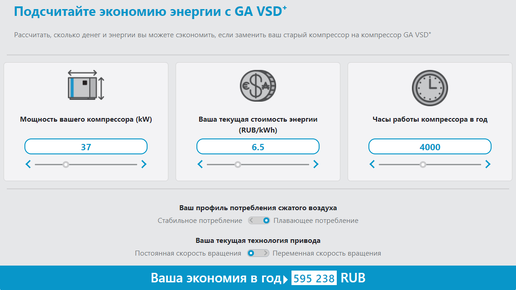 Калькулятор экономии энергии с компрессорами Atlas Copco