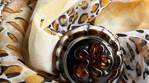 Легкий полупрозрачный платок/шарф с крупными цветами и леопардовым принтом в бежево‑жёлто‑коричневой гамме, собранный и зафиксированный