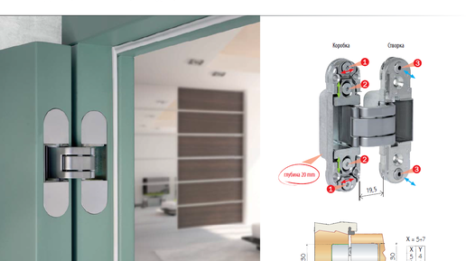 Для дверей устанавливаемых в одной плоскости с дверной коробкой. ECLIPSE 2.0 Для дверей устанавливаемых в одной плоскости с дверной коробкой. Возможность регулировать в трех направлениях. Движение створки свободное до 180°...