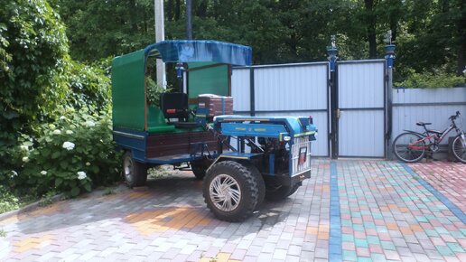 Урезанный задний мост и коробка передач ВАЗ-классика. прицеп самодельный , собран на заднем мосту ВАЗ 2108 с пружинами идет очень мягко. Запуск с электростартера , но можно и ручным. Всё управление осуществляется с водительского места( подача бензина,подсос,масса,блок запуска,замок зажигания,включение освещения) Свет спереди три фонаря ,можно по очереди, можно все сразу, сзади красные фонари. АКБ 12 в 10 а/ч, свет работает как от АКБ так и от генератора. ...