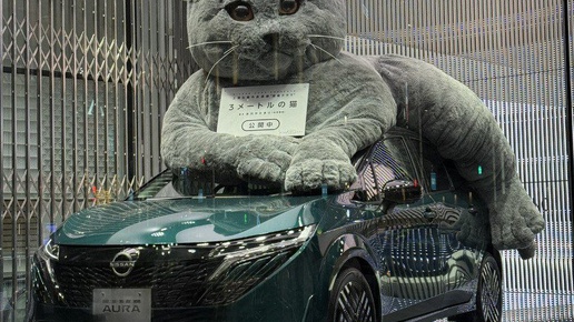 Nissan в Японии разместил огромного трёхметрового кота на своей новой модели Aura в выставочном зале, чтобы привлечь внимание к автомобилю