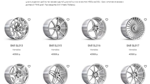 Помимо кованых дисков Slik, мы предлагаем альтернативные модели моноблочных кованых дисков Skill Wheels (не раскатка и не флоуформинг!) Данные дизайны рассчитаны по нагрузке на легковые автомобили и доступны для заказа с диаметром обода с 16" по 24"' и шириной обода от 6J до 14J. Также можем изготовить диск по вашему дизайну в нужном цвете. Ознакомиться с каталогом альтернативных дизайнов кованых дисков для легковых автомобилей можно в разделе на сайте - «Альтернативные дизайны для легковых автомобилей» В каталоге обозначена цена за один диск в стартовом диаметре 16x6J...