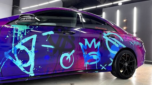 Абстрактное граффити на Mercedes CLA. Печать макета и оклейка автомобиля в винил.