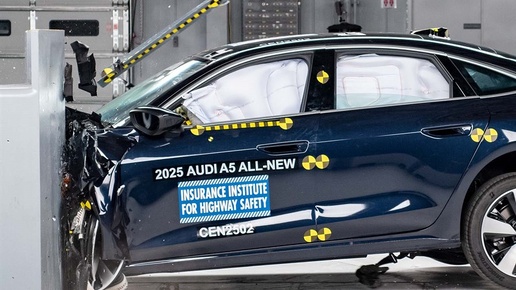 Почти 2 тонны в дверь на 60 км/ч: новая Audi A5 взяла максимум в американских краш-тестах. Но один пункт прям странный Самый неприятный городской удар не "в морду". Самый неприятный удар - это когда вы спокойно трогаетесь на перекрестке, и вам прилетает в водительскую дверь. В США такие сценарии проверяют максимально грубо: в бок летит подвижный барьер массой примерно 1,9 т., по высоте как передок современного кроссовера, и делает это на скорости около 60 км/ч. Причем "нос" у барьера не каменный - он деформируется и "обнимает" стойку между дверями, почти как в реальном ДТП...