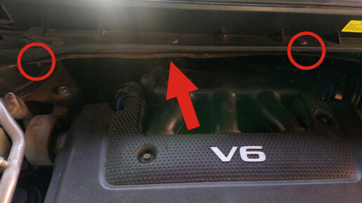 Со временем защита (звукоизоляция) моторного щита провисает. Пообщался с одноклубниками и сделал вывод, что защита провисает из-за моек подкапотного пространства. Защита набирает влагу и начинает провисать. У защиты есть три точки крепления — слева, посередине и справа. Нашел отверстие в распорке, к которой крепится защита. К это отверстие входит обычная клипса, которая используется для крепления решетки радиатора...