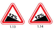 Знак 1.13 «Крутой спуск» предупреждает о том, что впереди крутой спуск. Знак 1.14 –«Крутой подъем» Как различить эти два , на первый взгляд , одинаковых знака? Воспользуемся левой рукой. Подставьте левую ладонь к наклонной линии над которой нарисованы проценты. Если пальцы ладони смотрят вниз, то впереди крутой спуск, если вверх, то крутой подъем. На спуске есть небольшая особенность. Обратите внимание на изображение. Допустим, вы водитель автомобиля, который движется с горы. Впереди вы видите...