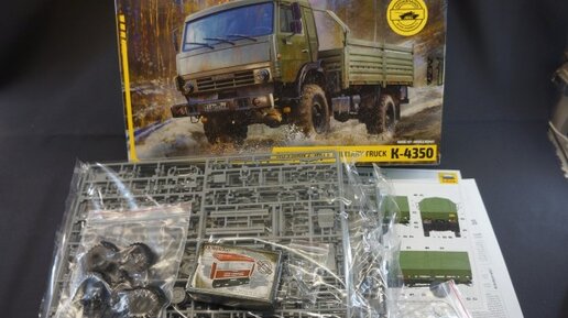 Продолжение линейки военных грузовиков: Российский двухосный грузовик К-4350 «Мустанг» от Звезды в 35ом масштабе. Содержание Обзор: Камаз К-5350 «Мустанг» от Звезды Грузовик К-4350 приехал из онлайн магазина Arma-models по предзаказу с дополнениями Общая информация Фирма производитель: Звезда Масштаб: 1/35 Артикул: 3692 Количество деталей: 485 шт Размер модели (мм): 22,7 см Ссылка на сайт производителя: http://www.zvezda.org.ru Внешний вид и содержимое коробки Фирменная коробка от Звезды с изображением Камаза в лесу...