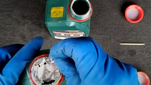 Если во время замены масла под рукой не оказалось лейки, а попадать в маслозаливную горловину полной канистрой – не ваш конёк, то сделайте вот что. Открутите пробку канистры, но не спешите удалять фольгу с горлышка. Вместо этого проделайте лезвием ножа 🗡 в нижней части небольшое отверстие в защитной фольге. В верхней части этой же фольги, используя зубочистку, сделайте несколько небольших проколов...