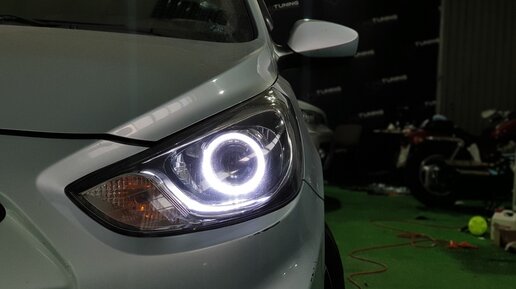 Автомобили Hyundai Solaris известны своим слабым штатным светом. В данном автомобиле нам были установлены би-диодные линзы, а в качестве ДХО - габарита бленда линзы со светодиодным "ангельским глазом". ⠀