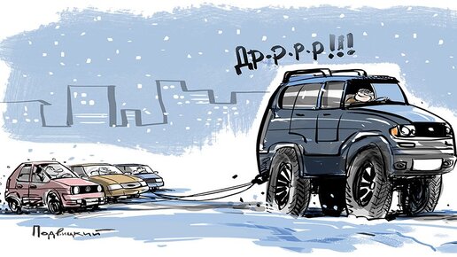 Купил я себе настоящий «джип». Большой, рамный, дизельный, с полным приводом и блокираторами, еще поставил на зиму огромные колеса на дорогой финской резине. И стал ждать, когда я смогу унижать и доминировать. Долго ждать не пришлось, при первом же большом снегопаде город опять встал в огромную пробку. Стою и я в ней, она не движется. Решил срезать через дворы. На зависть стоящим в пробке перемахнул через высоченный поребрик, так же неспешно через две линии трамвайки. Пересек встречку и ушел во дворы...