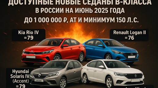 Условие: Рассматриваются новые седаны B-класса (не китайских марок), официально продающиеся в России по состоянию на июнь 2025 года. Все модели оснащены автоматической коробкой передач (AT, CVT или DCT) и имеют двигатель мощностью не менее 150 л. с. (при недостатке моделей с точно 150 л. с. включены близкие по характеристикам варианты). Цена нового автомобиля у дилера (без учёта трейд-ин) не превышает 1 000 000 ₽. Надёжность силового агрегата (двигатель+АКПП) подтверждена независимыми рейтингами 2024–2025 гг...