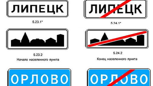 На дорогах Российской Федерации можно встретить два типа знаков, указывающих на начало и окончание зоны населённых пунктов: с белыми буквами на синем фоне и с чёрными буквами на белом фоне. В чём же их отличие? Оба типа этих указателей относятся к знакам особых предписаний. Они предназначены для того, чтобы обозначить границы населённого пункта и ввести в действие соответствующие скоростные ограничения. Знак 5.23.1 с чёрными буквами на белом фоне обозначает начало населённого пункта, в котором действует скоростной режим 60 км/ч...