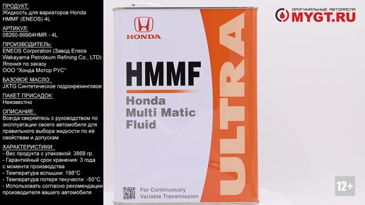 Продукт: Жидкость для вариаторов Honda HMMF (ENEOS) 4L Наш телефон: 8-800-550-57-22 ПН-ПТ 9.00-17.00 (МСК+4) Артикул: 08260-99904HMR - 4L Производитель: ENEOS Corporation (Завод ENEOS WAKAYAMA PETROLEUM REFINING Co., LTD.) Япония. по заказу ООО "Хонда Мотор РУС" Базовое масло: JXTG Синтетическое, гидрокрекинговое. Ссылка для покупки: https://mygt.ru/Oil/selection/honda-hmmf-4-l--maslo-v-akpp.html Особенности: Оригинальное трансмиссионное масло Honda HMMF обеспечивает работу системы CVT...