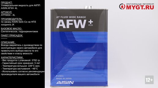 Продукт: Универсальная жидкость для АКПП Aisin AFW+ 4L Наш телефон: 8-800-550-57-22 ПН-ПТ 9.00-17.00 (МСК+4) Артикул: ATF6004 - 4L Производитель: по заказу Aisin Seiki Co на НПЗ холдинга JX Базовое масло: Синтетическое, гидрокрекинговое. Пакет присадок: -------- Ссылка для покупки: https://mygt.ru/oil/aisin/afw-wide-range-atf-4-l.html Автоматическая трансмиссионная жидкость эффективно передает мощность двигателя. Работает в широком температурном диапазоне -40 до +150С. Исключает задержки...