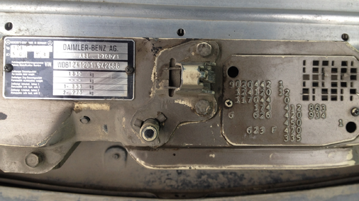 Заглянул под капот, там есть несколько табличек на передней перегородке. Табличка с кодами поближе На ней много циферок. Всего не знаю. 124120 значит, что у меня Мерседес 200 D 09/89-10/92 с двигателем 601.912 174 — это код отделки. Означает отделку винилом MB-TEX цвета Safran (Шафран, бежевый) 623 F- это код цвета. С завода мой мерседес шел в цвете Light ivory (нем. Hellelfenbein, слоновая кость). Буква означает тип краски. M — metallic paint, F — unicolor paint. Такие авто часто перекрашивают, чтоб срыть рабочее прошлое машины...