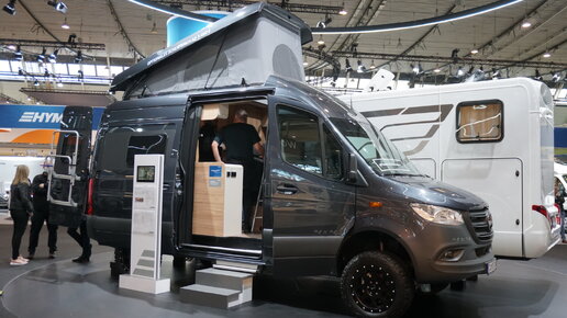 Автодом вышел в свет пару лет назад, но по-прежнему привлекает внимание. В этот раз для выставки поставили брутальные кованые диски и злую резину. Модель называется Hymer Grand Canyon S. Как дом на колесах ... этот вариант не блещет комфортом и дизайном. Тут все очень просто и практично для активных людей, которым, в первую очередь, важна надёжность техники. Услышав о стоимости в России в 125-130 тыс евро. Большинство делают круглые глаза. Да, вот так стоит эта техника, не без участия наших таможенных сборов и налогов...