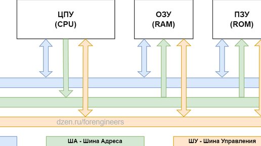 В самых-самых общих чертах я уже рассказывал о том, что такое микропроцессорная система. Сегодня копнём чуть глубже (но тоже не очень глубоко))). Основные части микропроцессорной системы (приведены как английские, так и русские названия, которые придуманы ещё в СССР): Всё это объединяется в одну микропроцессорную систему с помощью шин. Шина - это набор параллельных проводников (хотя иногда и каналы последовательной передачи данных тоже называют шинами), по которым передаётся цифровой сигнал. Эти проводники называются линиями шины...