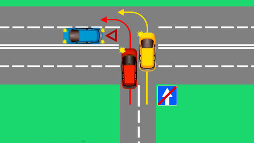 Порой даже опытные водители при повороте двух машин в одну полосу не могут разобраться кто кому уступает. А всё потому, что нужно чаще повторять теорию ПДД, поэтому разберём как раз такую задачку. Две машины - красная и желтая едут по дороге с односторонним движением. Обе они собираются повернуть налево. Красная машина начинает поворот, однако замечает, что левая полоса занята препятствием. Поэтому водитель берет траекторию чуть шире и хочет повернуть сразу в правую полосу. Но своим маневром он создает...