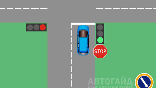 Для водителей-новичков спорная дорожная ситуация может легко подтолкнуть на штраф. Однако и опытные шофера умудряются порой не ответить на простые вопросы из теории ПДД. Рассмотрим простую на первый взгляд ситуацию на перекрестке. Водитель синей машины подъезжает к перекрестку и видит перед собой светофор, который горит зеленым. Казалось бы - спокойно можно проехать. Однако помимо светофора также присутствует дорожный знак "стоп", который означает что движение без остановки запрещено и нарисована стоп-линия...