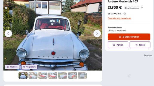 Советский раритет под названием «Москвич-407» выставили на продажу в Германии в городе Мальхов (земля Мекленбург-Передняя Померания). Машину 1958 года выпуска с заявленным пробегом всего 656 км оценили в 21,9 тыс. евро — примерно 2 млн рублей по текущему курсу. Автомобиль сохранил оригинальный дизайн и укомплектован всеми необходимыми документами, есть действующий техосмотр до 2027 года...