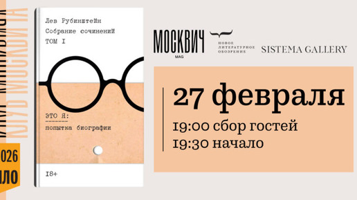 Для тех, кому важно не только читать о культуре, но и обсуждать ее вживую, «Москвич Mag» запускает новый формат — клуб «Москвича». Это серия регулярных встреч, где мы собираем горожан, друзей издания, экспертов и авторов московских проектов для разговора об актуальных книгах, кино и выставках. Клуб «Москвича» откроется 27 февраля в 19.00 чтениями текстов Льва Рубинштейна из первого тома «Это я» нового собрания сочинений, вышедшего в издательстве «Новое литературное обозрение». Вечер пройдет в галерее современного искусства Sistema Gallery (Бобров переулок, 4, стр...