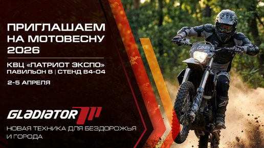 LADIATOR Motors — новый бренд мототехники, созданный компанией MDV Group, которая уже более 15 лет развивает рынок техники для активного отдыха и внедорожных приключений в России. Под брендом GLADIATOR также выпускаются лодки, лодочные моторы и сап-борды на собственных фабриках в России и за рубежом. Также MDV Group является официальным дистрибьютором техники AODES в России (кроме ЦФО, ПФО, ЮФО, СКФО) На выставке «МотоВесна 2026» GLADIATOR впервые представит новое направление техники: — Эндуро мотоциклы в топовых комплектациях...