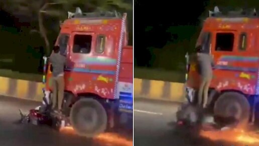14 апреля один из участников дорожного движения, возвращавшийся на автомобиле с работы домой, в городе Хайдарабаде (штат Телангана, Индия), запечатлел незавидную ситуацию, в которою угодил местный мотоциклист. Владелец двухколёсного средства для передвижения, оказавшись на пути у грузовика, каким-то чудом уцелел и зацепился за боковую дверь большегруза, требуя у водителя остановиться...