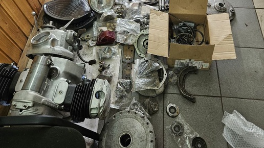 Из того что не опубликовывали: в работу на полное восстановление поступил мотоцикл М-72 Н с коляской. К нам в мастерскую МотоЛенинград он прибыл в разобранном виде, много запчастей уже куплено заказчиком, двигатель и коробка также уже в готовом виде...