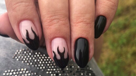 Всем привет! В этой статье расскажу вам и покажу какой маникюр клиенты выбирают под определённый случай. Сегодня я делала ногти для байк уикенда или мото фестиваля. Прошлый маникюр относился на отлично, без сколов и поломок. Клиентка сама попросила помочь ей с выбором дизайна. Но была оговорка, о том, что основной цвет должен быть обязательно чёрный! Я подсказала, что здорово будут смотреться языки пламени на всех или нескольких ногтях...