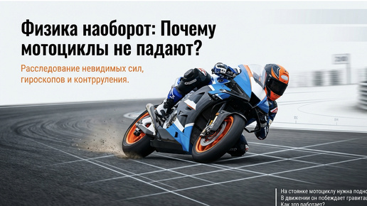 Мотоцикл кажется устройством, нарушающим законы логики. Если вы оставите его на месте без подножки, он неминуемо рухнет на землю под действием гравитации. Однако стоит ему набрать скорость, как он обретает невероятную устойчивость. Эта презентация — настоящее расследование. Мы разберем невидимые силы, которые вступают в игру на ходу: выясним, действительно ли нас спасают гироскопы, и узнаем о главном секрете управления — контррулении. Управление двухколесным транспортом для большинства из нас — это навык из детства...