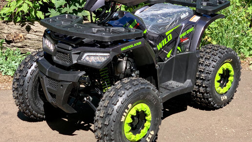 Квадроцикл MotoLand Wild 125 – стильный, модный, молодёжный. Данный квадроцикл имеет модный дизайн с яркими элементами. Квадроцикл имеет 4-х тактный бензиновый двигатель объёмом 125 куб. см., который способен развивать скорость в 60 км/ч. Имеется механический ограничитель скорости. Двигатель приводит в движение прочную металлическую цепь, которая приводит в действие заднюю ось. Цепь имеет металлическую защиту снизу от механических воздействий и пластиковую защиту сверху от пыли и грязи. Квадроцикл...