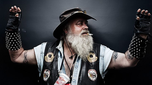 Классика - кожаные штаны, казаки, кожаная жилетка на голое тело, на одном предплече татуха ZZ Top, на другом - AD/DC. И... Огромная белоснежная шевелюра с кудряшками, и такая же белоснежная борода до пупа...