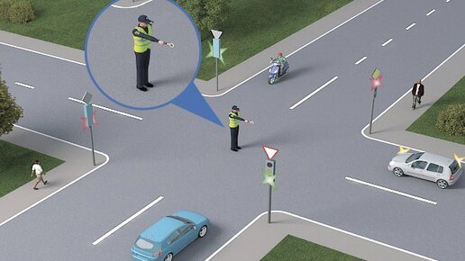 Кому можно проехать перекрёсток при данном сигнале регулировщика?