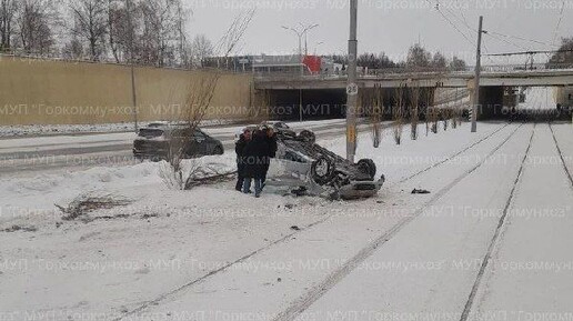 Пьяный водитель перевернулся на Hyundai в Челнах и парализовал движение трамваев