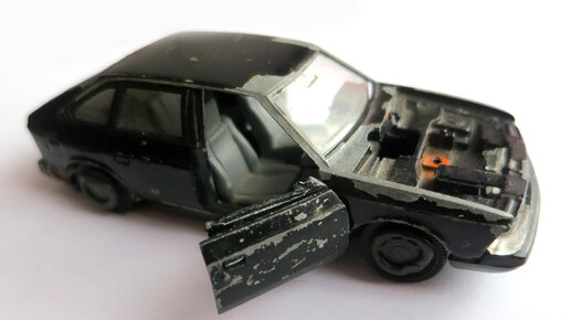 Приобрел разбитый Москвич 2141 как донор кузова - нужен был без повреждений. Фото было плохое размытое, продавец сказал, что кузов целый, все нормально. В таком виде получил модель: Хороший кузов на первый взгляд, но при ближайшем рассмотрении вижу пролом под лобовым стеклом в месте крепления капота. Ну все, донор негоден. Что делать? Придется восстанавливать несостоявшегося донора. Разбираем все: Двери по всей видимости съела чума, т.к. оставшаяся накладка на дверь развалилась при снятии: Итого: отсутствуют детали и нужно раздобыть: Снимаем краску растворителем...