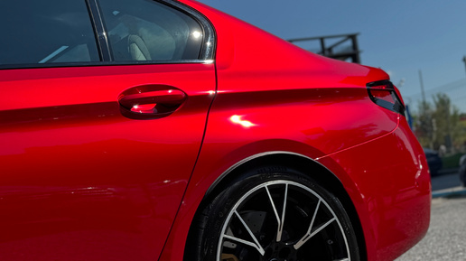 Оклейка автомобиля BMW M5 competition полиуретановой пленкой сочного алого оттенка