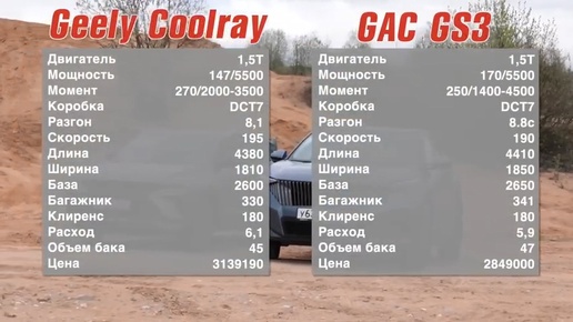 Сегодня у нас сражаются за ваши голоса и наши очки два обновленных китайца – Geely Coolray и GAC GS3. Машины похожи по характеристикам, но что любопытно: хотя вторая побольше и помощнее, а стоит дешевле... Ну, поглядим. Для начала сравнили двигатели. Это не один и тот же мотор с разной настройкой, они просто однотипные – алюминиевые четверки на полтора литра с наддувом, но никак не из одной конюшни. Любопытно, что в GAC GS3 двигатель мощнее, а вот крутящий момент у него меньше. И работает он тише и спокойнее...