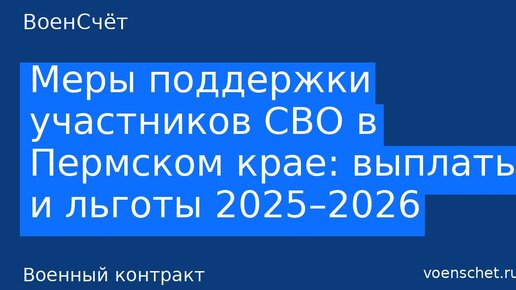 Льготы СВО Пермский край в 2025–2026 годах включают крупные региональные и федеральные выплаты, а также адресную поддержку семей. Ниже — суммы, условия и порядок оформления. Что Сумма/условие Где оформлять Основание Региональная единовременная выплата при заключении контракта 1 500 000 ₽ (контракт ≥ 1 года) Минсоцразвития ПК / МФЦ Сообщение органов власти ПК (действует в 2025 г.). admuswa.ru Федеральная единовременная выплата контрактникам 400 000 ₽ (контракт ≥ 1 года) Военкомат/часть → перечисление на счёт Правительственные разъяснения/КонсультантПлюс...