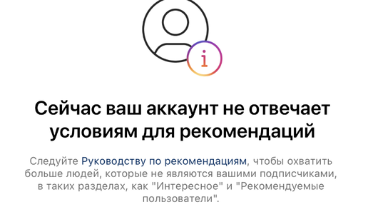 Ваш аккаунт и контент не отвечает условиям для рекомендаций. Причина блокировки – Нарушения правил сообщества. Последствия: Аккаунт пропадет из рекомендаций рилсов, постов и даже из хештегов. Пользоваться этим аккаунтом можно, но как-то бессмысленно.