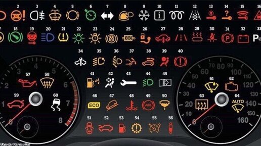 1. Противотуманные фары (передние). 2. Неисправность усилителя рулевого управления. 3. Противотуманные фары (задние). 4. Низкий уровень жидкости стеклоомывателя. 5. Износ тормозных колодок. 6. Значок включённого круиз-контроля. 7. Включены поворотные сигналы. 8. Датчик дождя и света. 9. Зимний режим. 10. Индикатор информационного сообщения. 11. Индикация работы свечи накаливания. 12. Мороз. 13. Индикация обнаружения бесконтактного ключа. 14. Ключ не обнаружен. 15. Батарея ключа нуждается в замене...