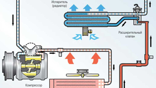 Работа системы кондиционирования Большинство современных автомобилей оснащено кондиционером. Такая система позволяет подавать в салон воздух, температура которого ниже температуры за бортом. Это становится возможным благодаря рабочему материалу – хладагенту. В процессе функционирования системы он переходит из жидкого состояния в газообразное, ввиду чего существенно охлаждается. Отметим, что работа кондиционера происходит за счет усилия, которое компрессор получает от коленчатого вала. Компоненты системы: Компрессор и шкив коленвала связаны ремнем...