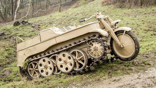 Этот бронированный мотоцикл использовался германской армией на полях сражений Второй Мировой войны. Гибрид мотоцикла и минитанка начал выпускаться в Германии в начале 40-х годов прошлого столетия. Свое название, SdKfz 2 Kettenkrad, это детище германских инженеров получило от симбиоза двух немецких слов - «трек» и «мотоцикл». Мотоцикл оснащался 1,5-литровым двигателем Opel, мог развивать скорость до 50 км/час и преодолевать подъемы с уклоном до 25 градусов. Управление такое же, как и на мотоцикле, путем поворота переднего колеса...